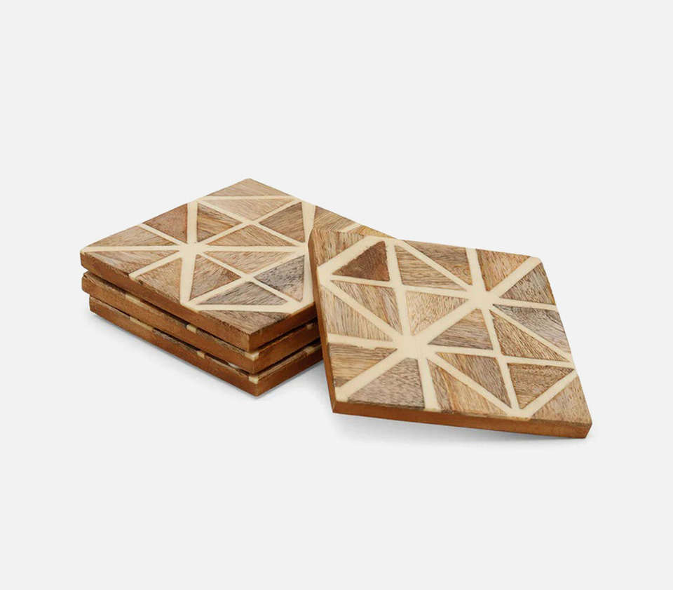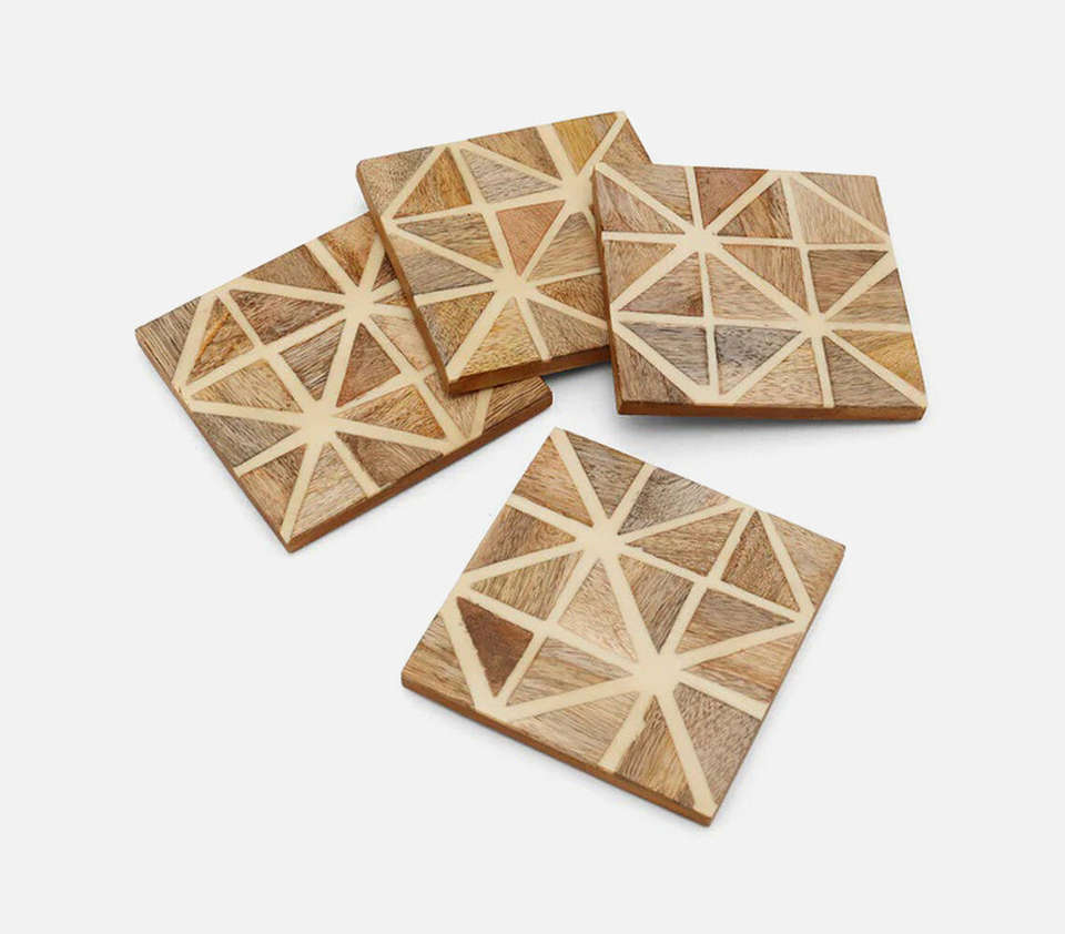 Modern Square Wooden Coasters Set With Geometric Triangle Mosaic Inlay Design Bulk Wholesale Custom Logo Engraved Drink Mat