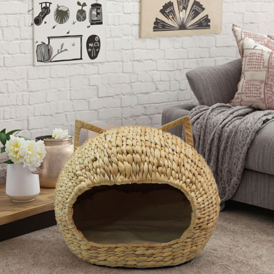 Modern Style Natural Fiber Woven Cat House Eco-Friendly Solid Wood Rattan Cage for Small Animals Breathable Design Pet Furniture