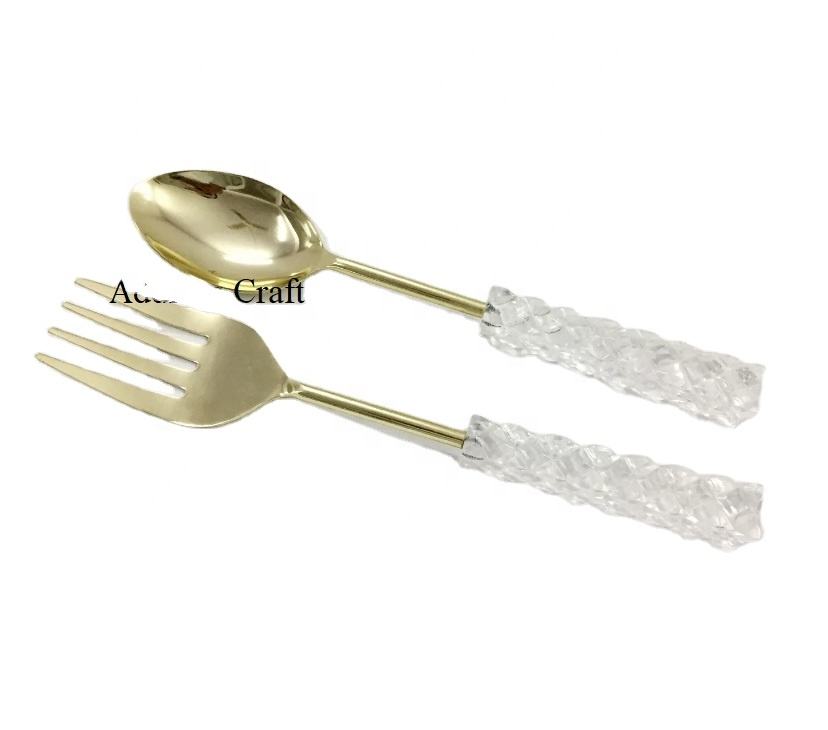 Modern Style Stainless Steel Gold Plated Salad Server Set Vintage Acrylic Handle Serving Tools Kitchen Tool Serving Spoon Fork