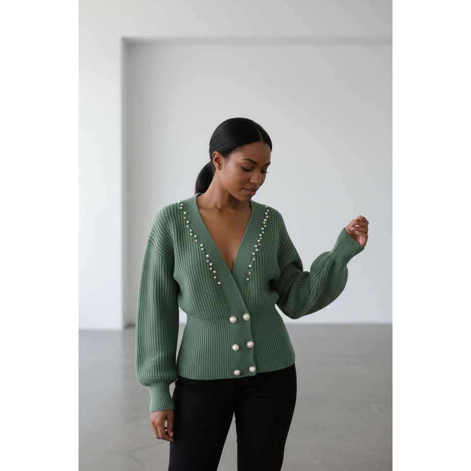 Modern Style V-Neck Knitted Cardigan for Women Double Row Button Detail with Stone Embellishment