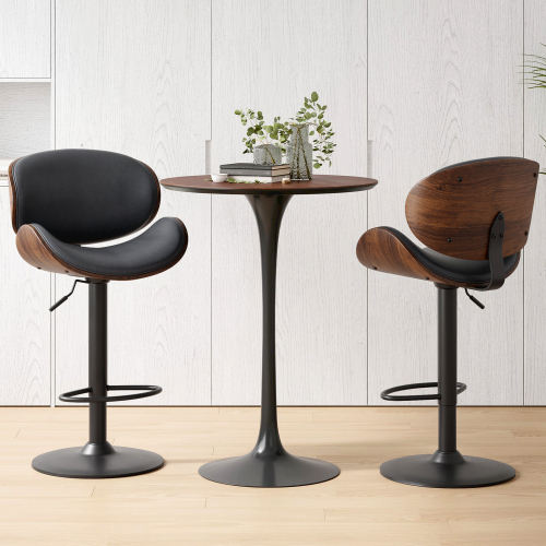 Modern Swivel Bar Stools Set 2 Adjustable Height Bentwood PU Leather Upholstered Seat Backrest Footrest for Hotel Dining Iron