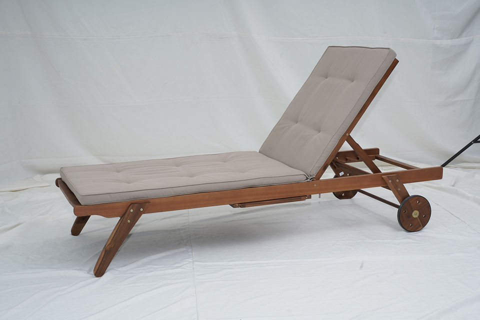 Modern Teak Color Sun Lounger with Grey Blue Cushion for Outdoor Hotel Courtyard or Villa Furniture Project