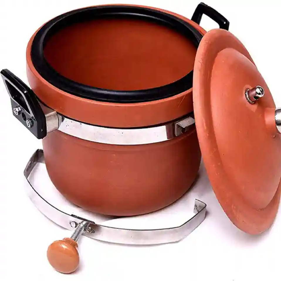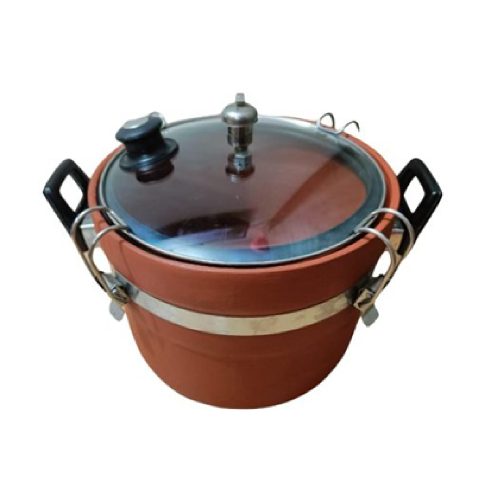 Modern Terracotta Pressure Cooker with Glass Lid Partially Open - Earthenware Cooker Combining Tradition and Convenience