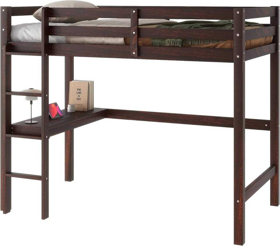 Construction:Loft bed with sturdy ladder and shelves, built-in L-shaped desk