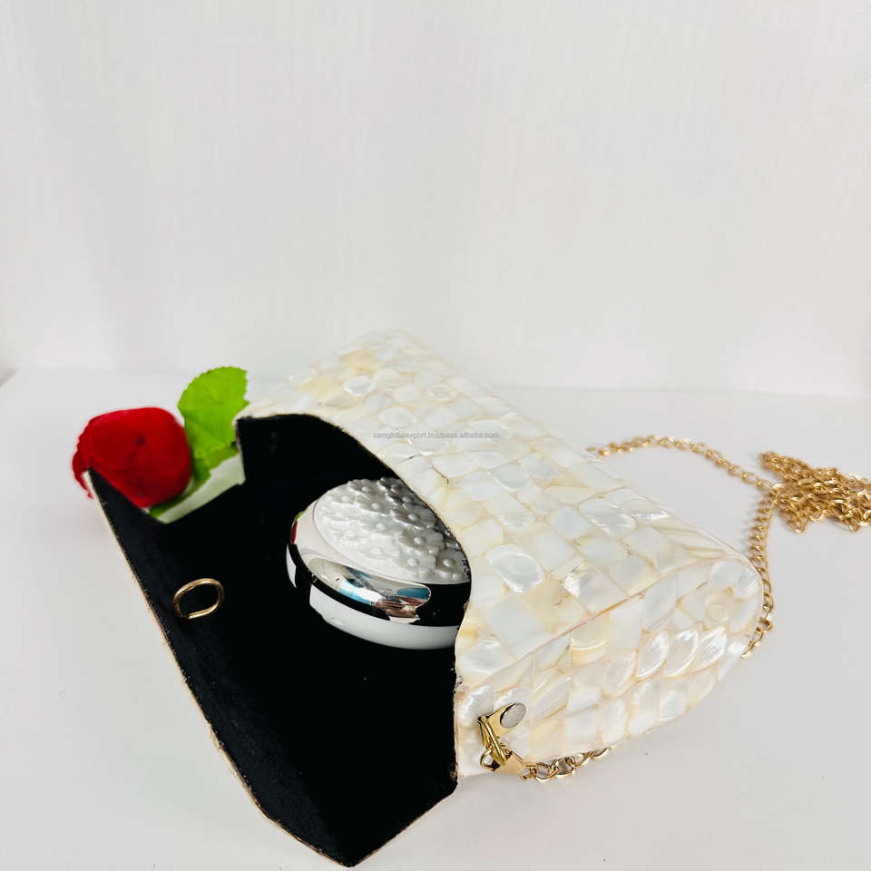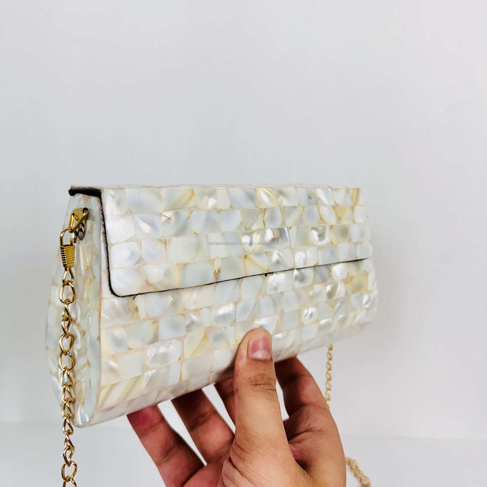 Modern Vintage Antique White Beige Mother Pearl for Shell Envelope Sling Design Polished Sculpture Crossbody Bag Metal Crafts