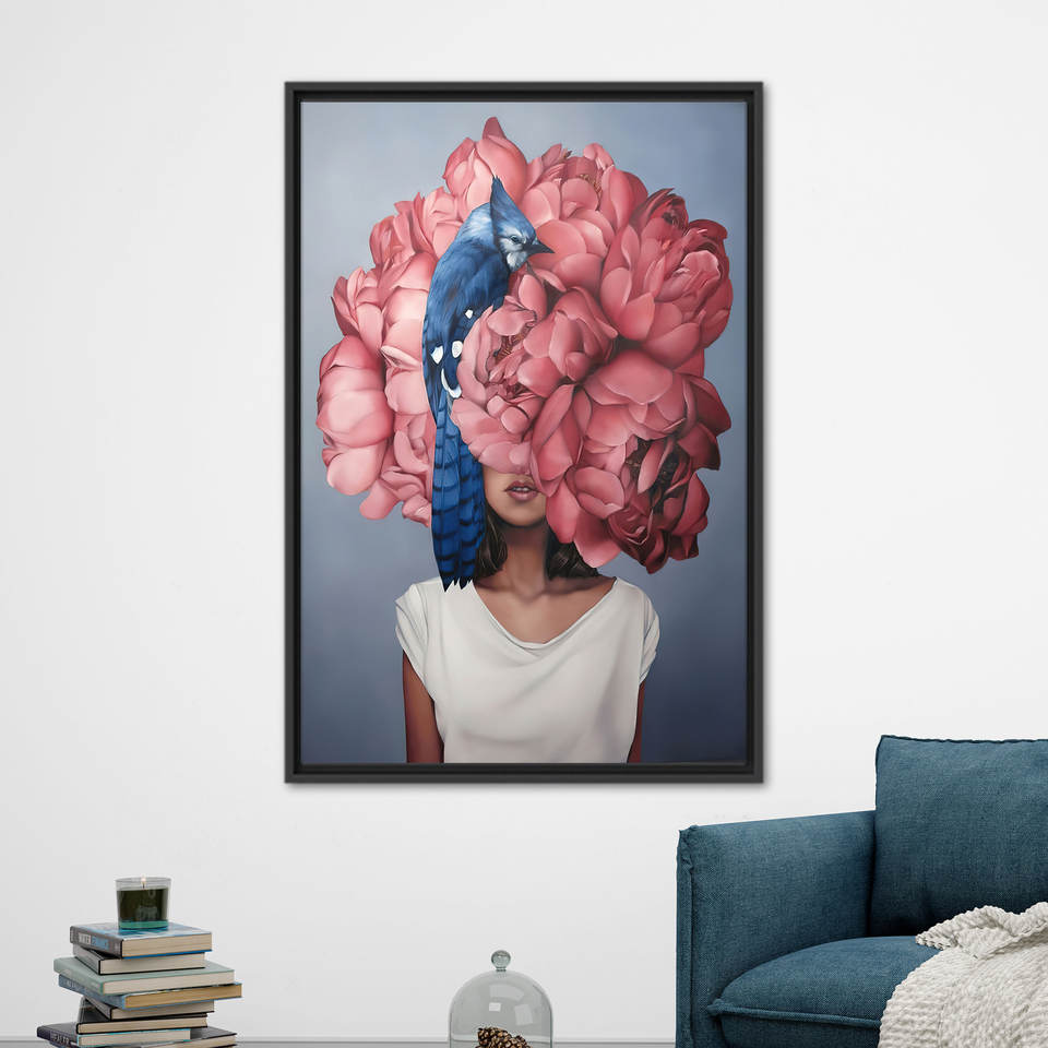 Modern Wall Decor: Pink Floral Woman Canvas Print - Large Abstract Art,Black Framed