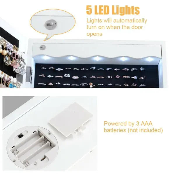 Modern White Lockable Wall Mounted Mirror Jewelry Armoire with 5 LEDs and 6 Drawers