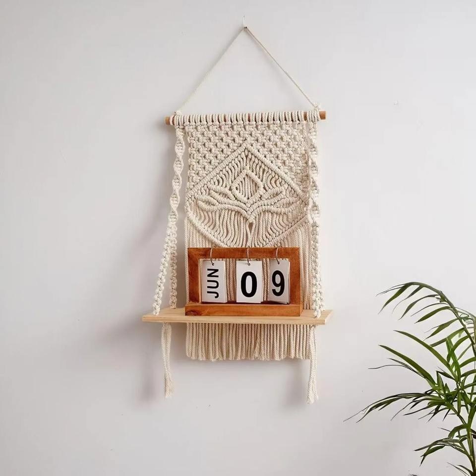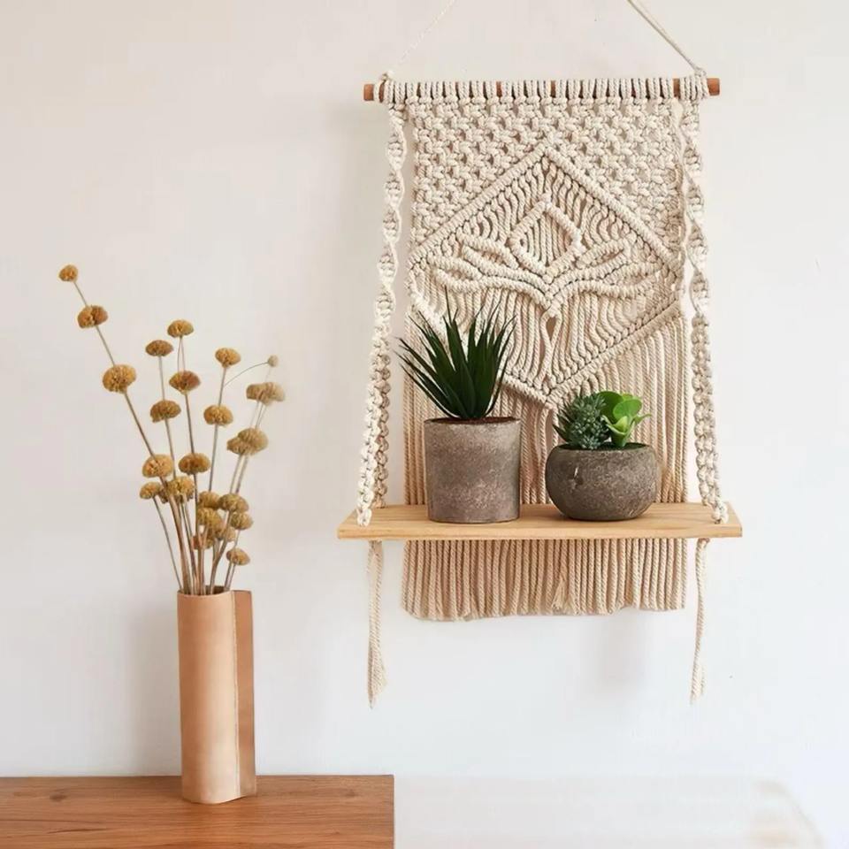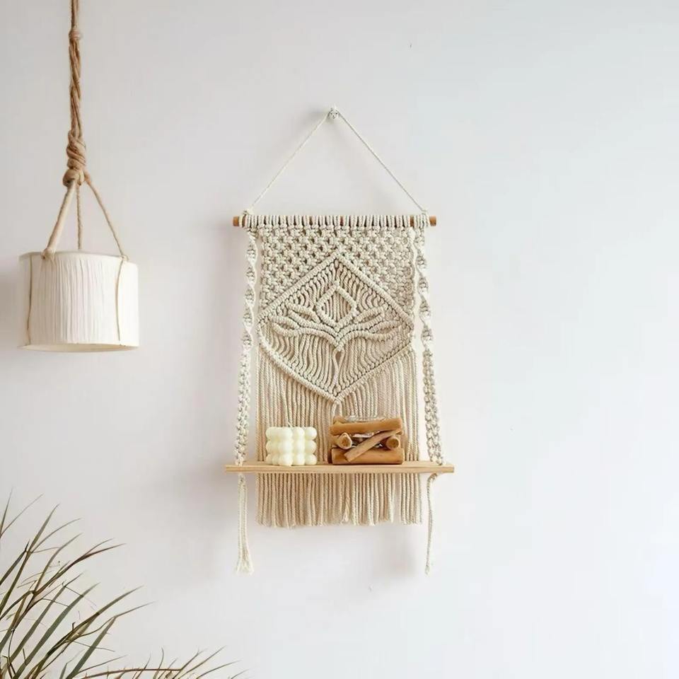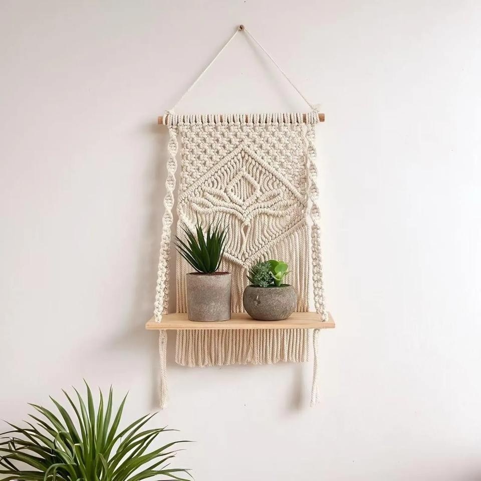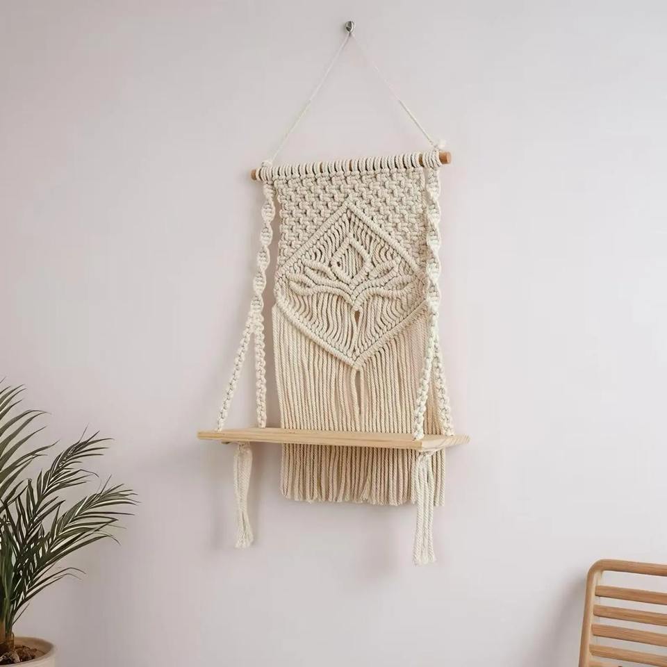 Modern White Macrame Wall Hanging With Wooden Shelf Suitable For Home Decoration Planter Holder And Storage From India