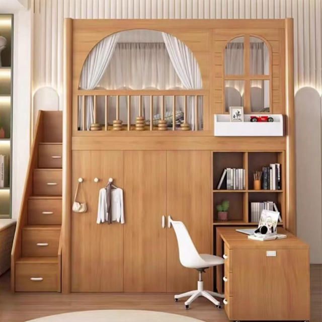Modern Wood Kids Elevated Loft Bed with Desk Wardrobe Bunk Beds for Bedroom