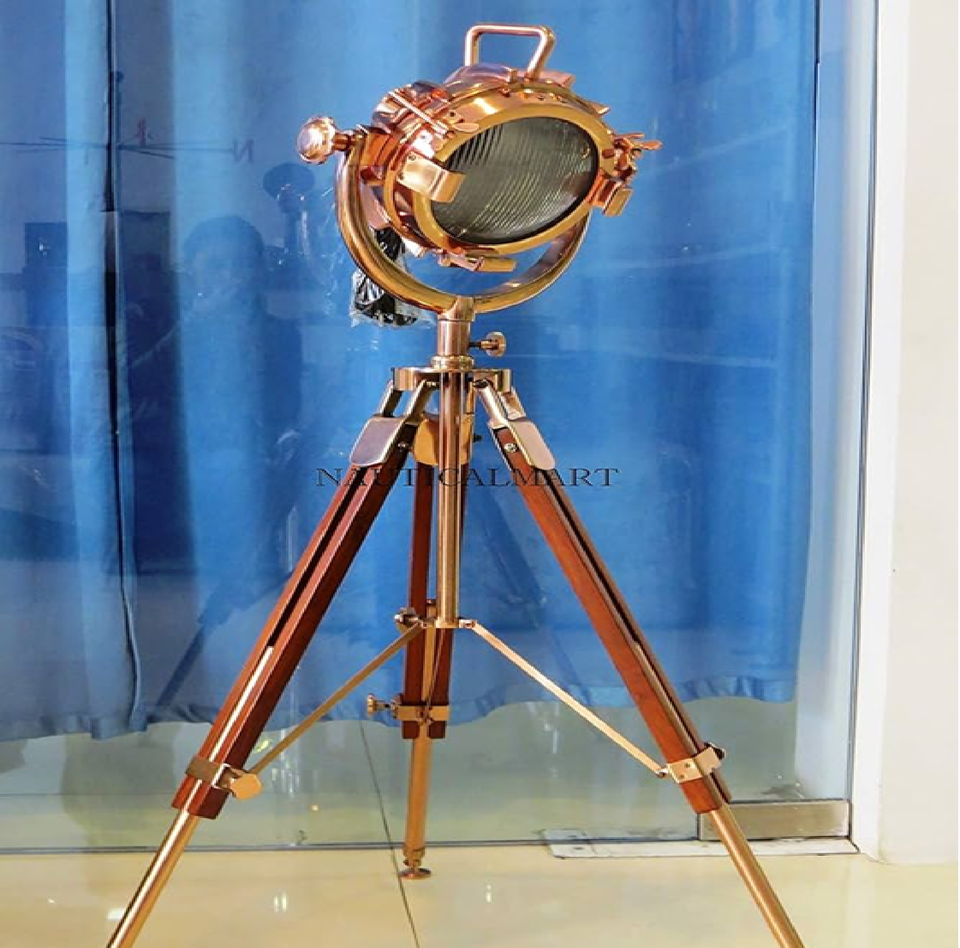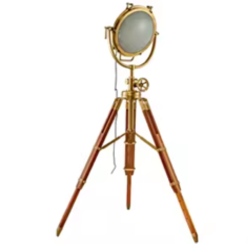 Modern brass metal shade tripod floor lamp with a rich sheesham wood base, combining contemporary design with vintage appeal