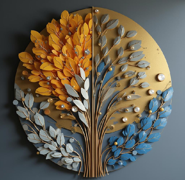 Modern circular tree of life metal art in blue and gold tones. Available at wholesale prices.