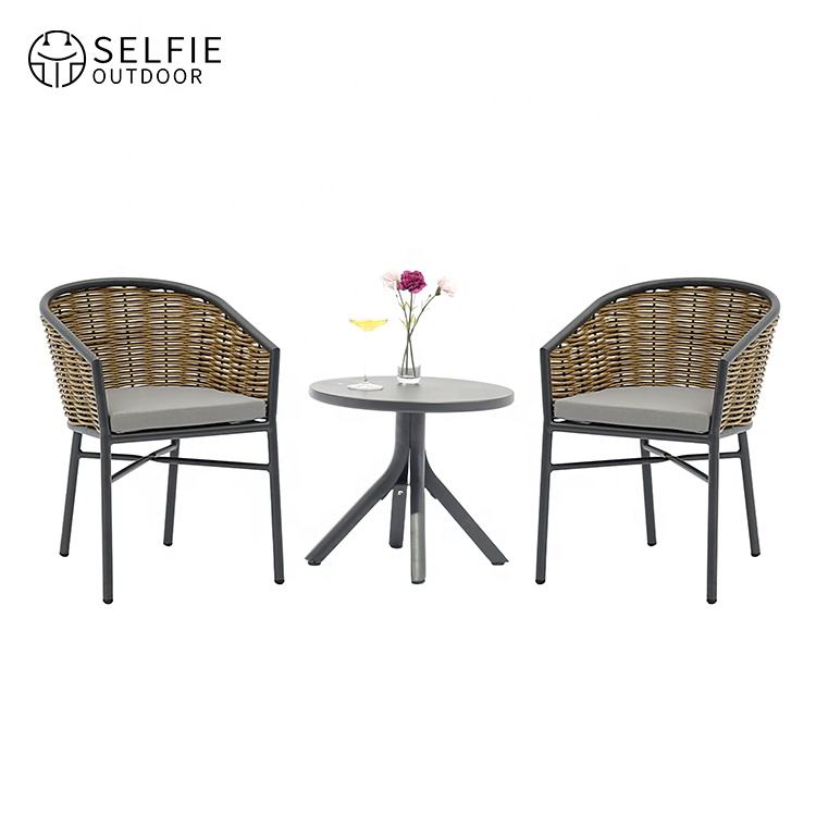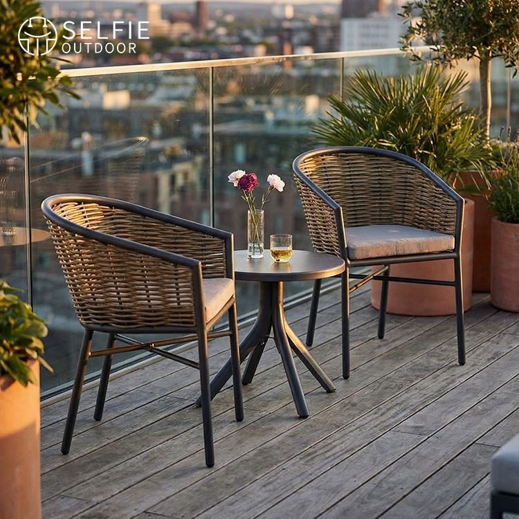 Modern Rattan Outdoor Dining Set for Hotel Garden Restaurant Cafe & Balcony-round Dining Table Chairs with Waterproof Cushions