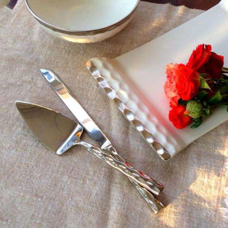 Modern hammered finish metal cake server with sleek grip suitable for contemporary kitchen and elegant dessert presentation