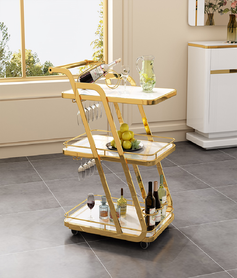 Modern luxury bar trolley with gold frame and marble shelves, perfect for sophisticated homes. Available at wholesale prices.