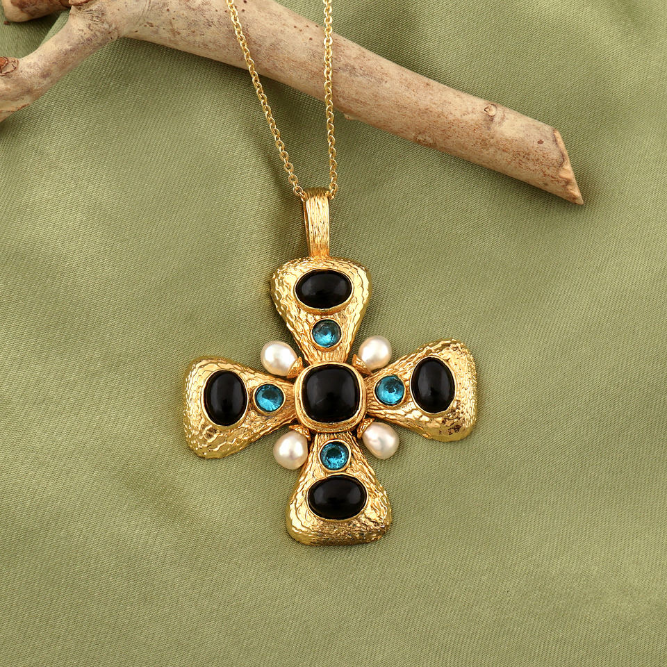 Modern style jewelry black onyx with white pearl charms designer cross pendant necklace gold plated chain fashionable necklace