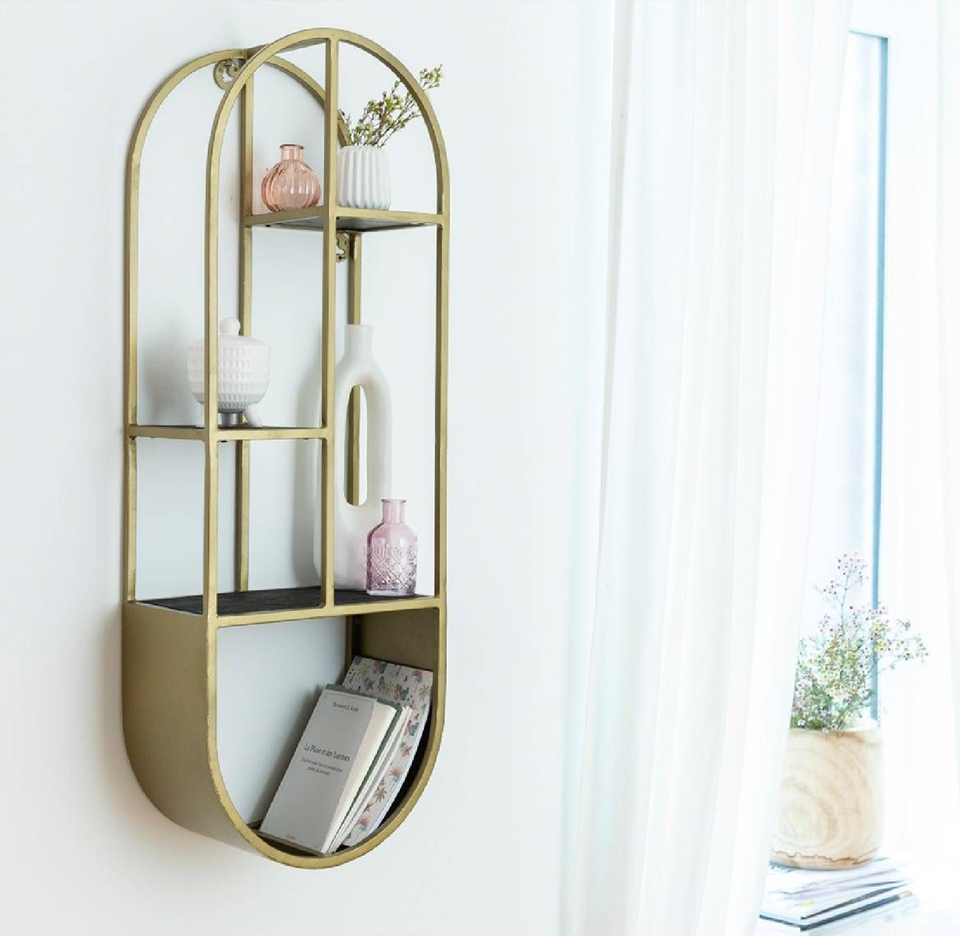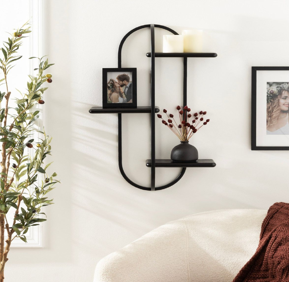 Modern suspended wooden wall shelves with black metal frame, ideal for display. Available at wholesale prices.