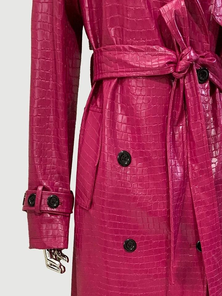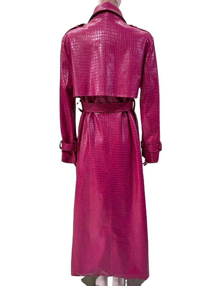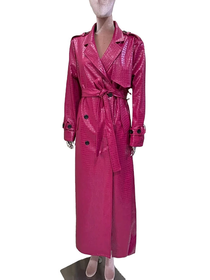 Modern women leather trench coat with double buttons and pockets for business or evening looks
