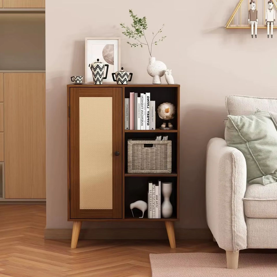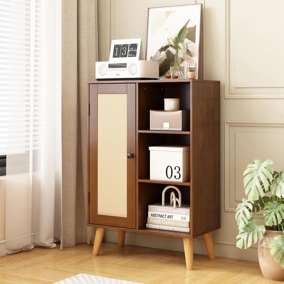 Modern wood and rattan One Door Cabinet with Open Shelves Modern Walnut Finish Storage Unit for Living Room and Bedroom Decor