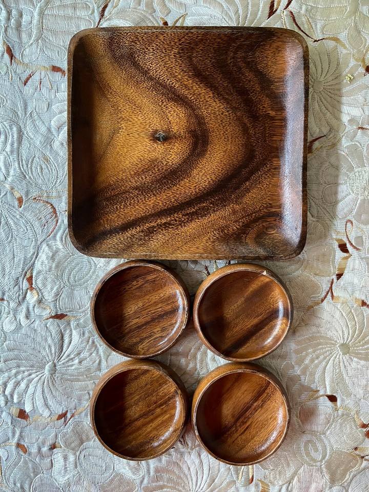 Modern wooden snack bowl set of 4 with 1 square tray and brown finish luxury look for home, kitchen, restaurant, serving snack