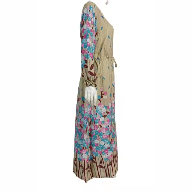 Modest Abaya for Women Casual Floral Muslim Dress with Drawstring at Waist and Sleeves