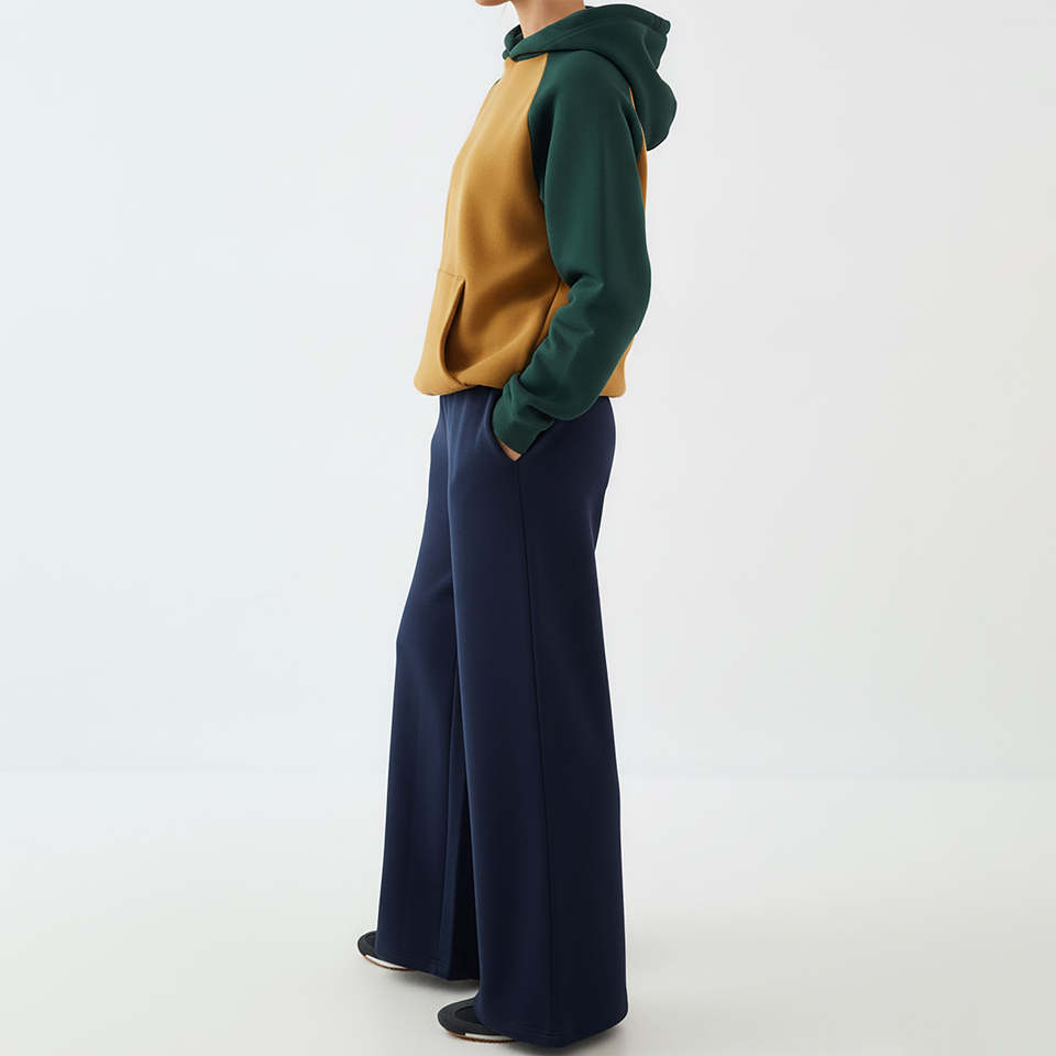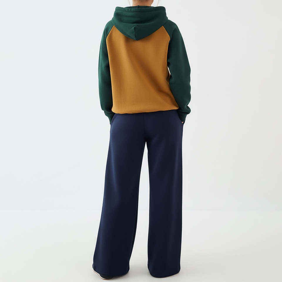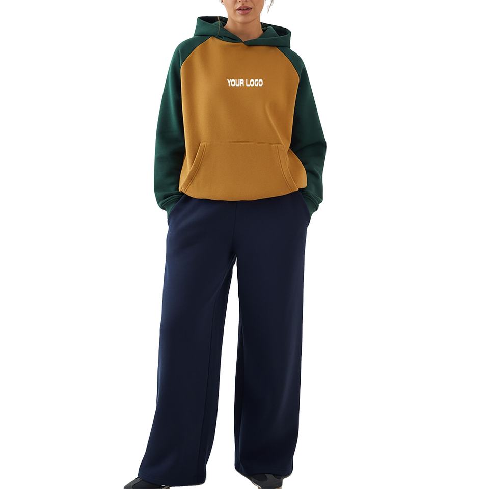 Modest Women Color Block Tracksuit Set 500GSM Cotton Fleece Hoodie Wide Leg Pants Winter Streetwear Wholesale