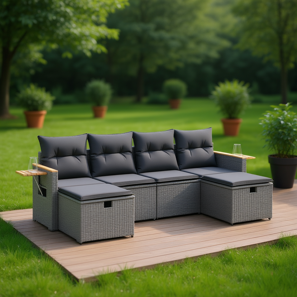 Modular Grey Pe Rattan Garden Sofa Set 6 Seater Outdoor Furniture With Storage Cushions Contemporary Design