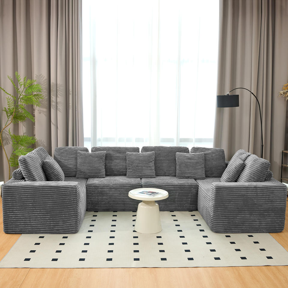 Modular U-Shape Sectional Sofa 6-Seater Chaise Lounge Reversible Design Striped Corduroy Fabric Convertible Modern Living Room