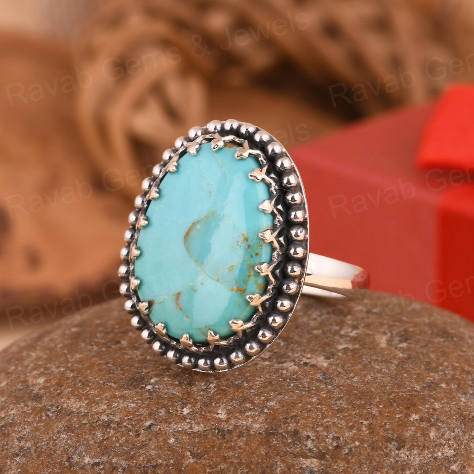Handmade Solid 925 Silver American Kingman Arizona Turquoise Gemstone Cabochon Bohemian Beaded Vintage Statement Ring for Women