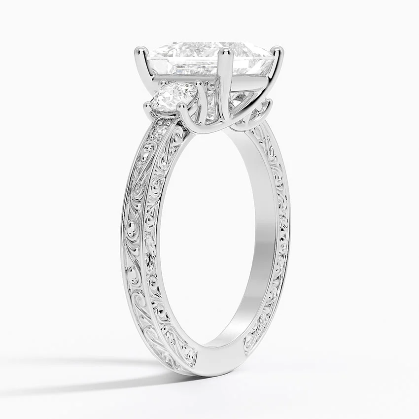 Moissanite Antique Scroll Engraved Vintage-Inspired Three Stone Princess Cut Diamond Luxury Wedding Engagement Ring 925 Silver
