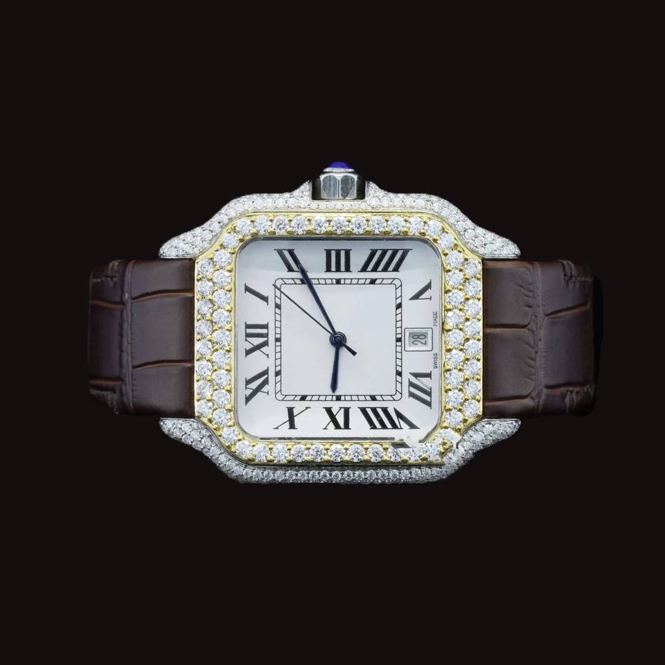 Moissanite Diamond Classic Roman Dial Watch Half Iced Out Square Case Brown Leather Strap Wrist Watch White Face Bling Timepiece