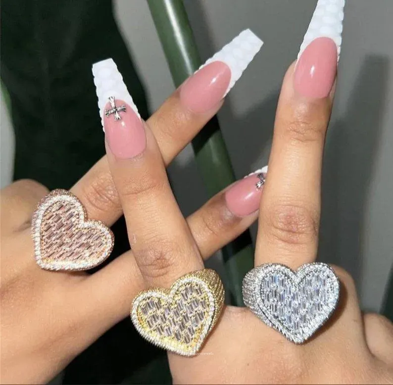 Moissanite Heart Luxury Rhodium Plated 925 Sterling Silver Bold Hip Hop Statement Ring Lab Created for Women