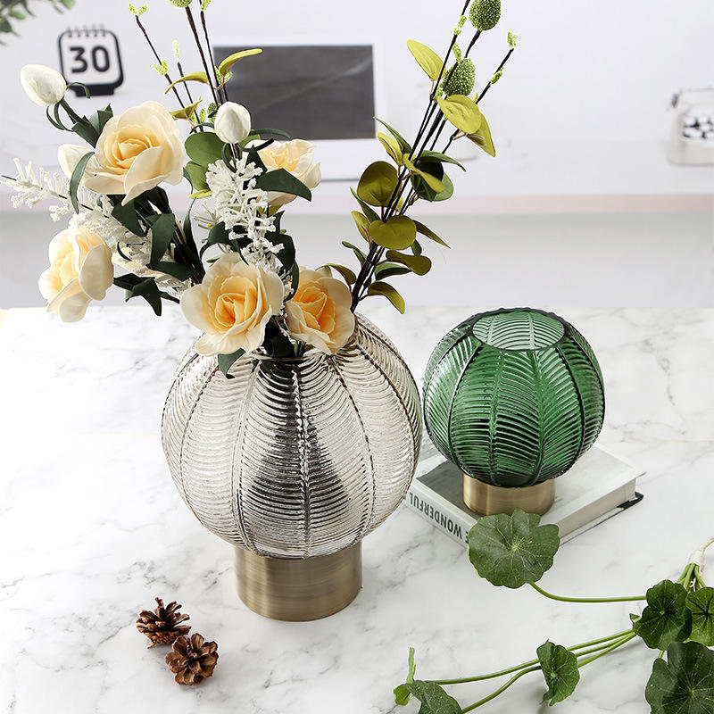 Moissic Nordic Style Glass Vase Light Luxury Green Coffee Bottom Metal Copper Ring Home Wedding Decorations Flower Arrangements