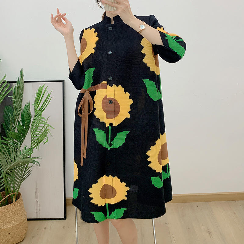 Mom's Dress Pleated Dress Large Size Design Sunflower Stretch Dresses Middle-aged and Elderly Women's Single-breasted Cardigan