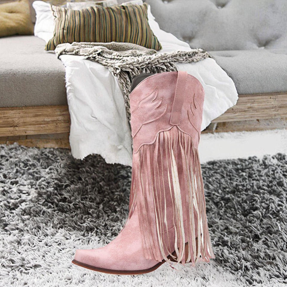 Moncheer Women's Western Fringe Cowboy Boots Slip-On Summer Winter Black Faux Suede Pointed Toe Mid-Calf Embroidery Cone Comfort