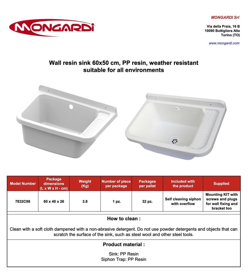 Mongardi L60 X W40 X H25 cm Granite Wall-Mounted Utility Sink PP Resin with Drain Fixing Kit for Home or Commercial Use