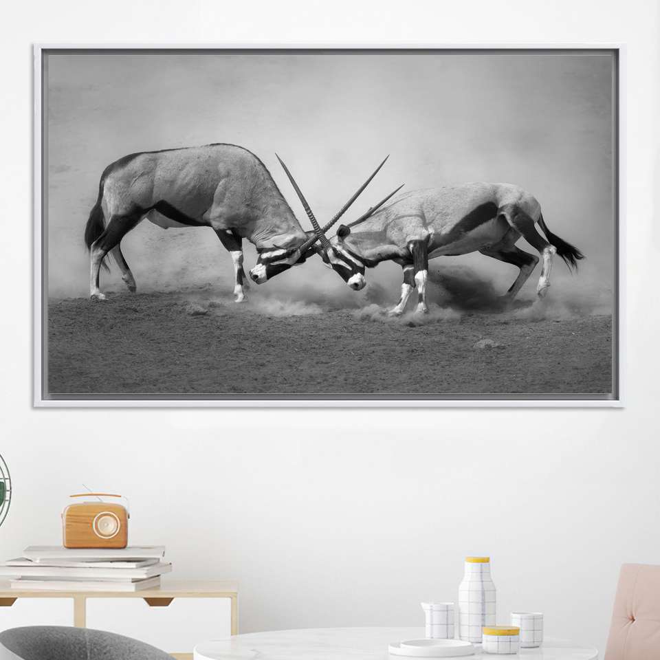 Monochrome Oryx Antelope Fight Canvas Print - African Wildlife Art,WHITE FRAMED CANVAS