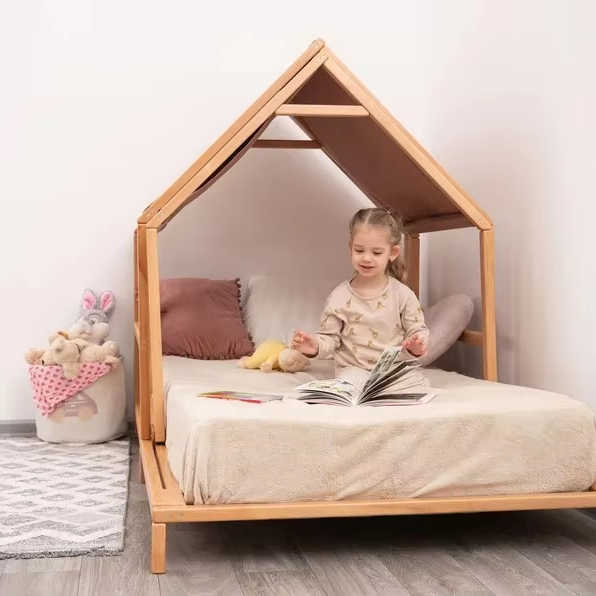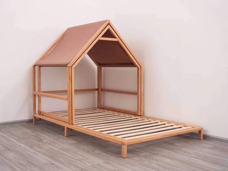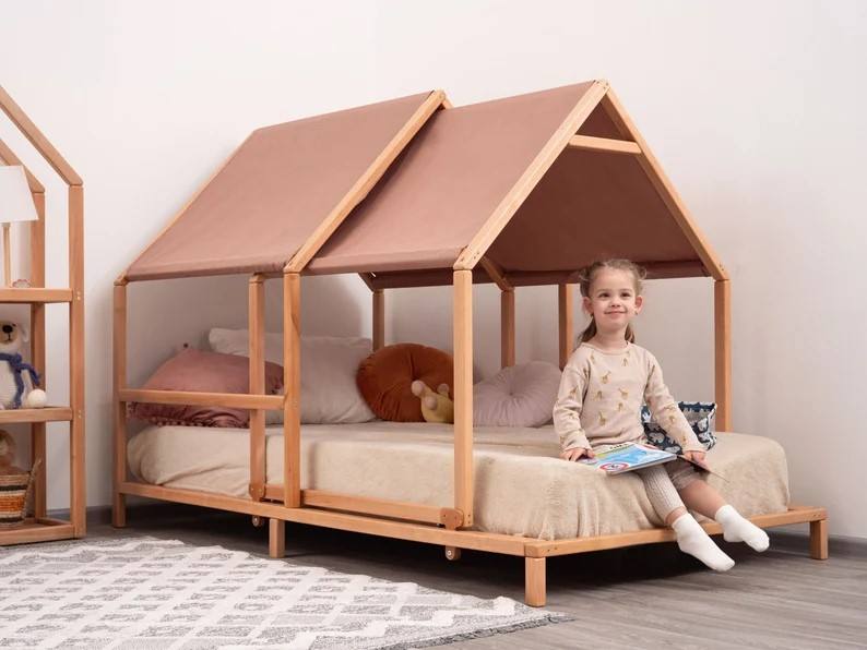 Montessori Furniture Handmade Low Profile Bed Frame Canopy Toddler Bed with Nursery Decor Classic Loft Bed for Toddler's Sleep