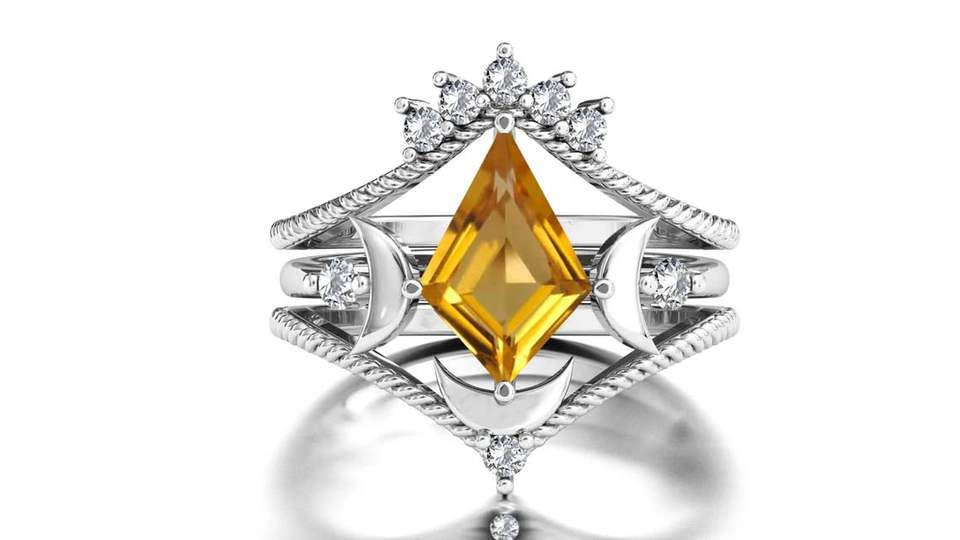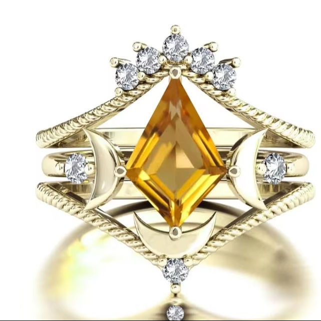 Moon of My Life 925 Sterling Silver Art Deco Kite Shaped Engagement Ring Wedding Party Jewelry Set with Citrine Stone