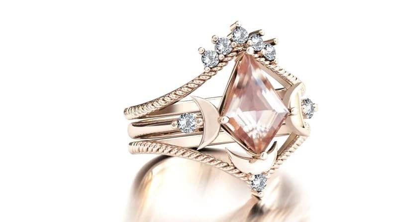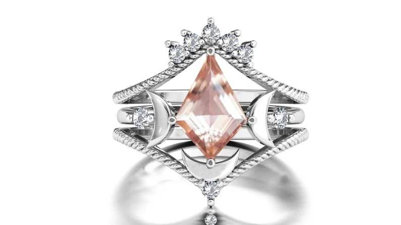 Moon of My Life Kite Shaped Morganite Wedding Ring Set Classic Antique Art Deco Engagement Ring with Rhodium Plating for Parties