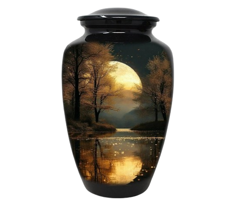 Moonlit Forest Reflection Metal Cremation Urn with Golden Full Moon Artwork for Tranquil Memorial Ashes