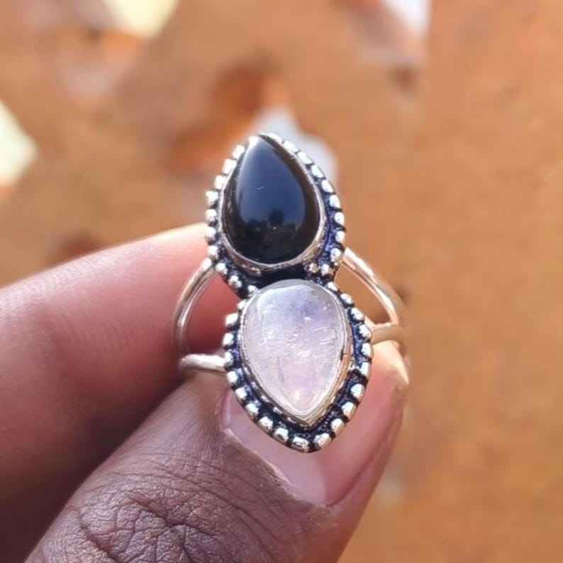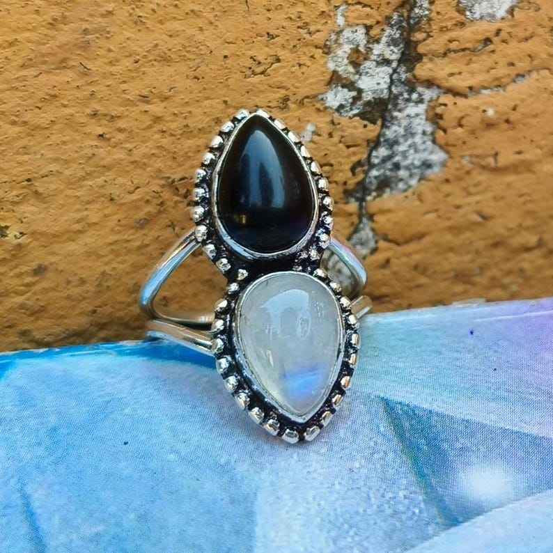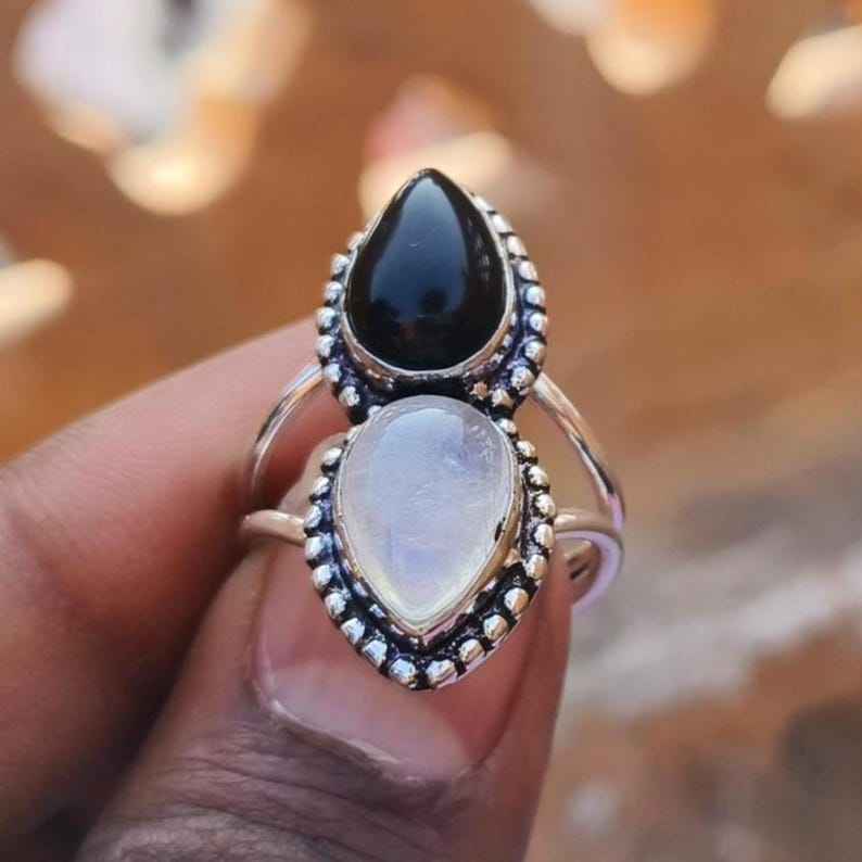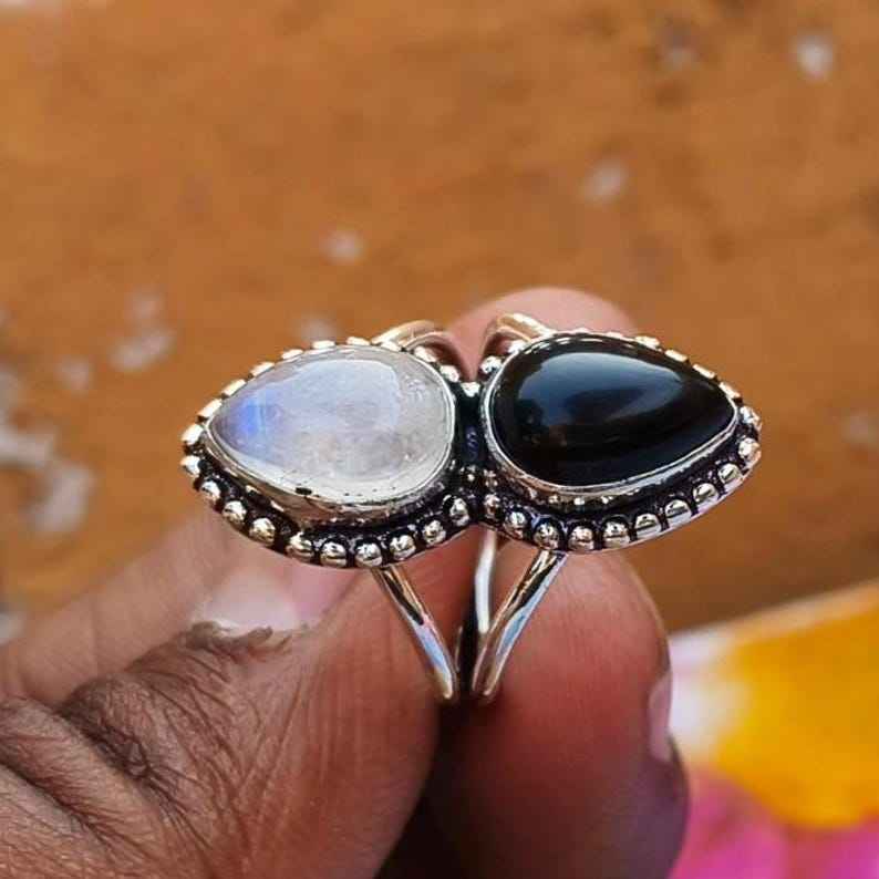 Moonstone And Black Onyx Ring 925 Sterling Silver Statement Ring Boho Mystic Gemstone Jewelry For Women