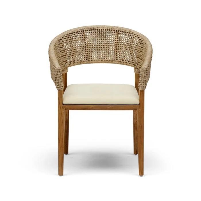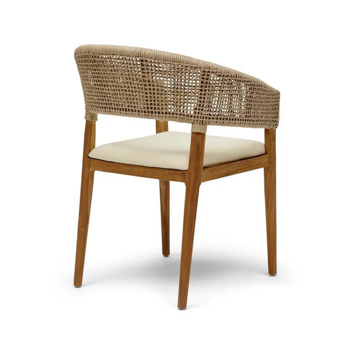 Mora Modern Garden Dining Chair Made of Quality Solid Teak Wood and Woven Rattan with Waterproof Cushion for Outdoor Use.