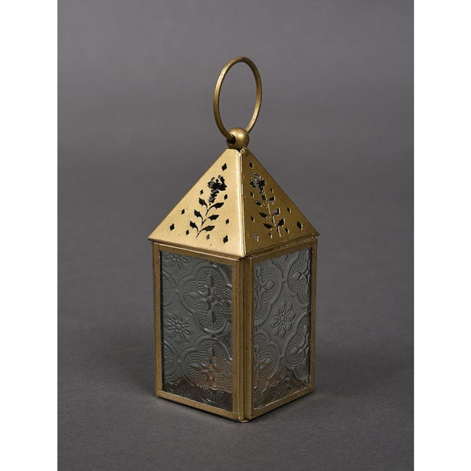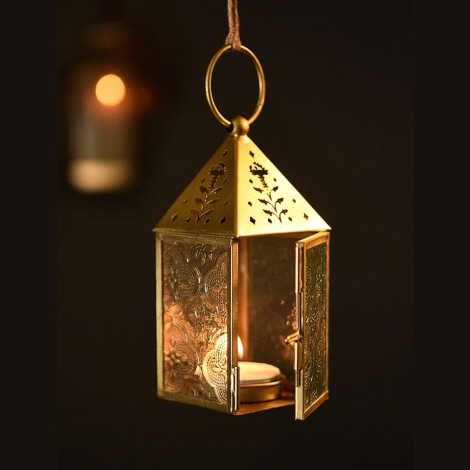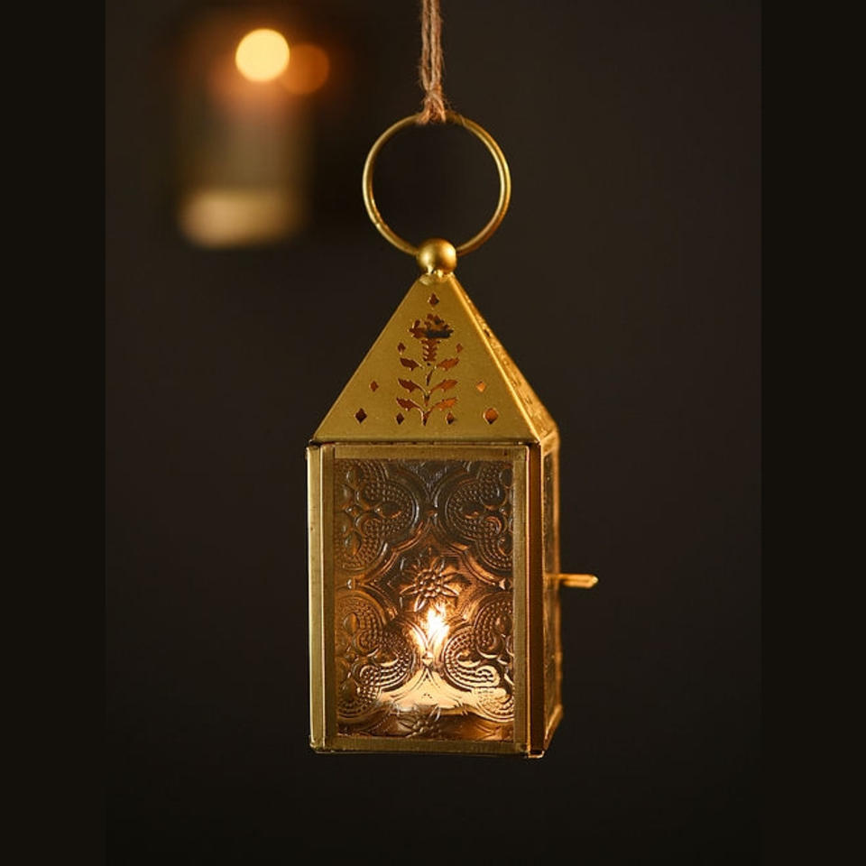 Moroccan Gold Mini Lantern with Designer Iron Top and Glass Pillar Holder Handmade Hanging Home Hotel & Restaurant Decoration