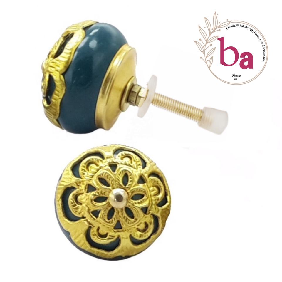 Moroccan Luxury Gold Filigree Flower Teal Ceramic Knobs Drawer Cabinet Handle Pulls for Kitchen & Bedroom-CK 558