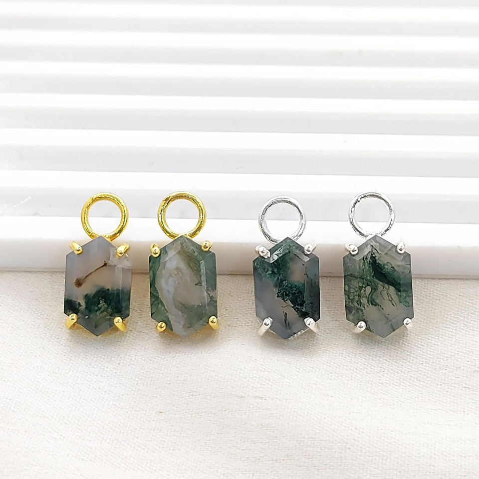 Moss Agate Charm 12x8mm Hexagon Prong Set Pendant 925 Sterling Silver Gold Plated Moss Agate Silver Charm Wholesale Bulk Jewelry