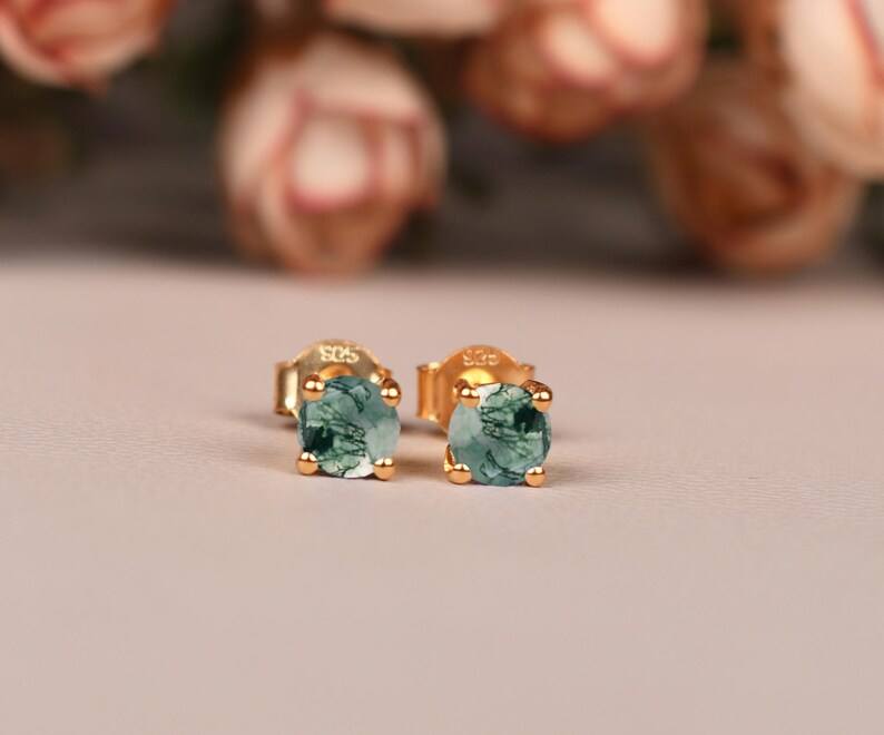 Moss Agate Stud Earrings 925 Sterling Silver 14K Gold Plated 4mm Round Elegant Gemstone Earrings