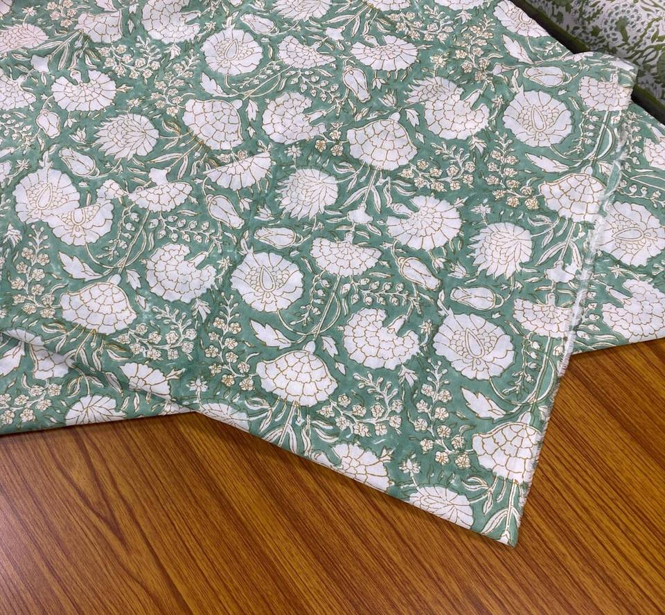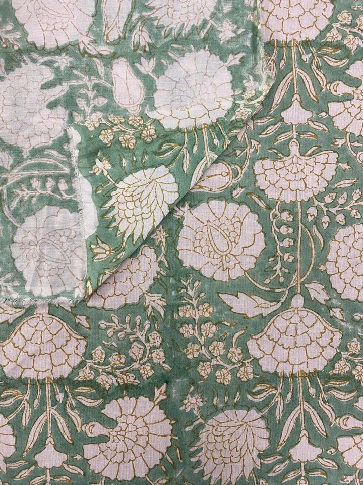 Moss Green Hand Block Printed Cotton Fabric: Blue Floral Print Sewing Dress, Women's Clothing, Quilting Fabric, Curtain, Napkins