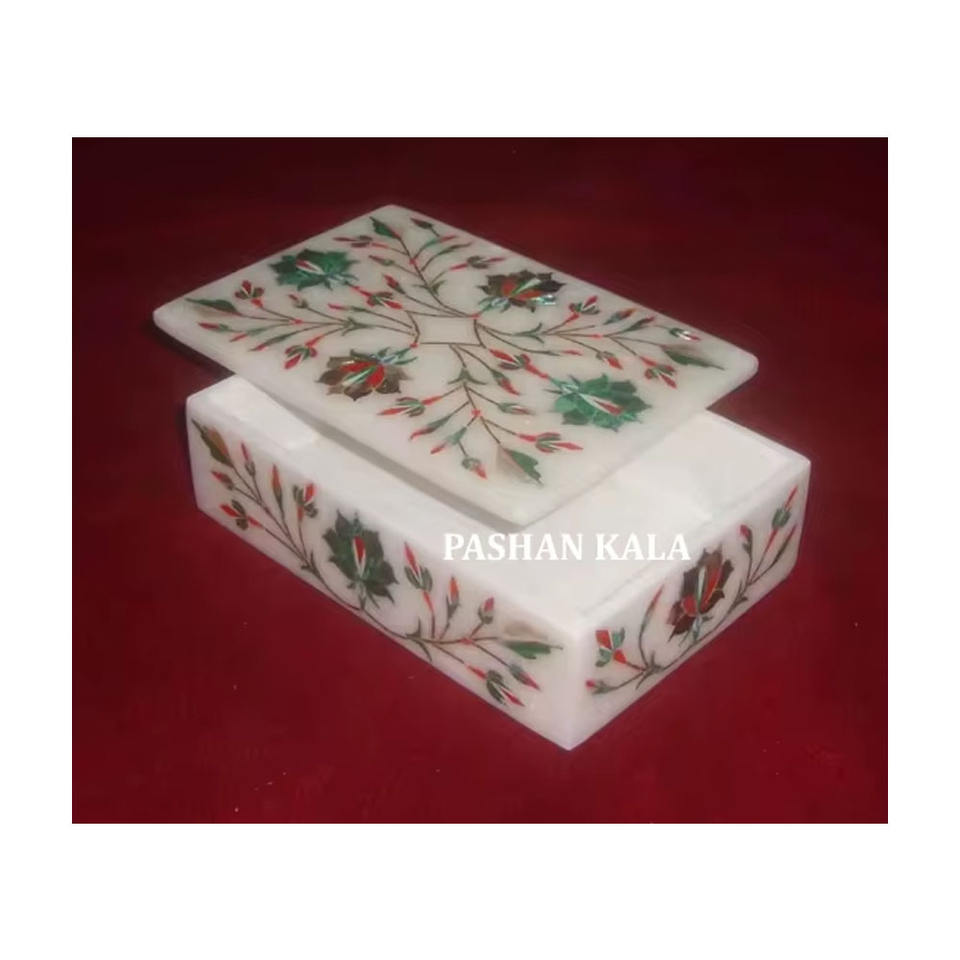 Most Beautiful White Marble Inlay Jewellery Box Multi Color Handmade Flower Design Best Quality Rectangle Shape Used Home Decor