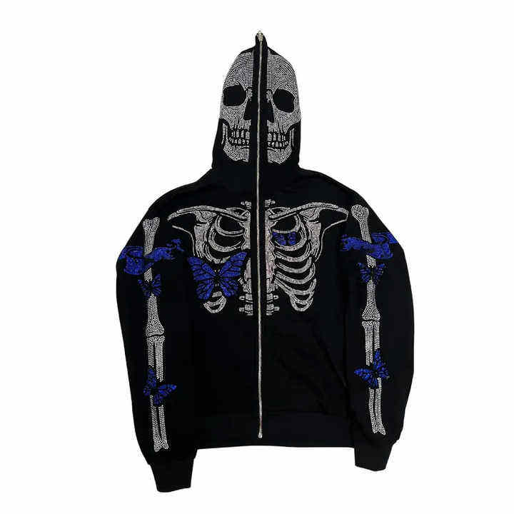 Most Demanding Rhinestone Skeleton Full Face Hoodie Oversized Blank Custom Rhinestone Full Zip Up Hoodie