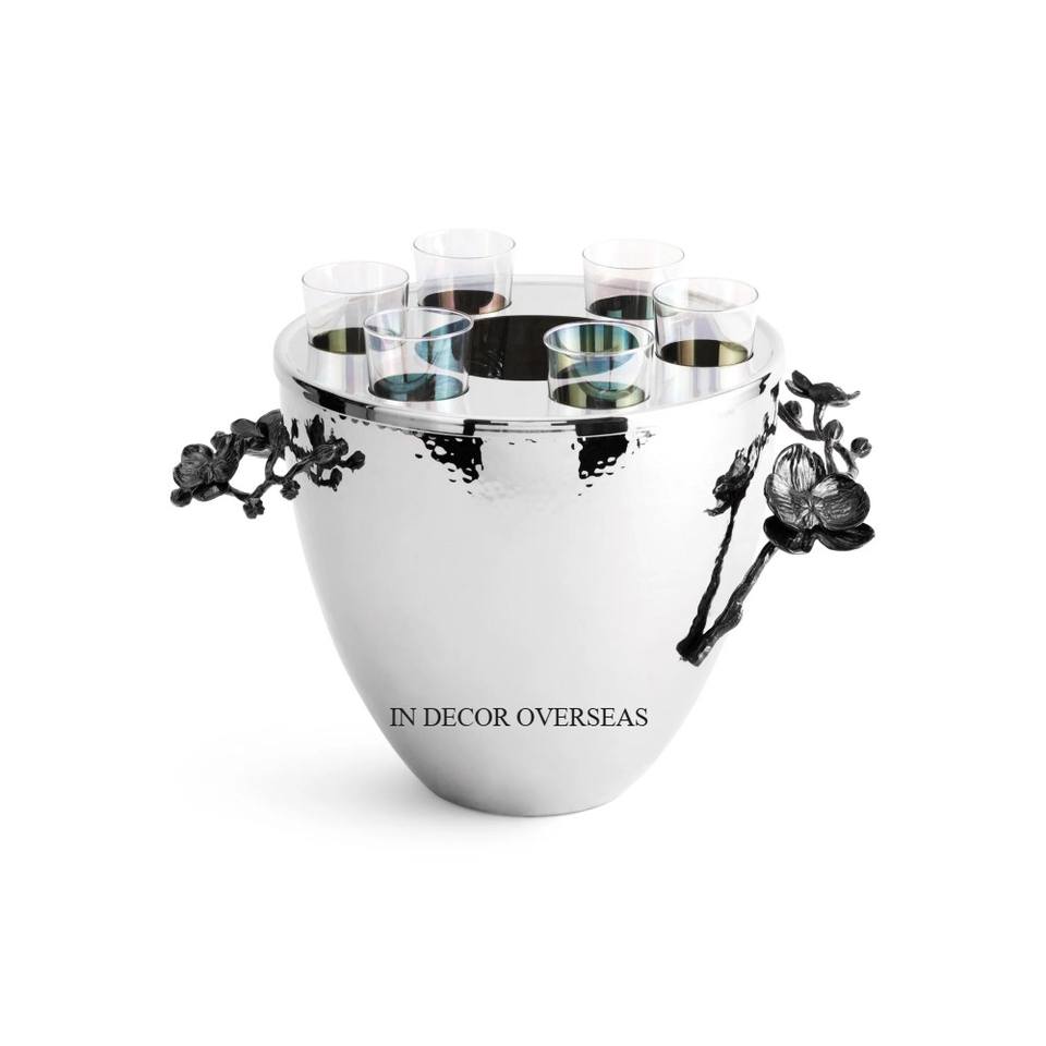Most Demandng Hammered Texture Silver Shiny Polished Stainless Steel With Black Flowers Design Wine Bottle & Glass Holder Bucket